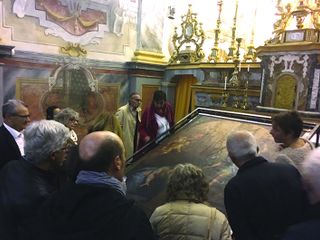 Quindi, esposti nella sacrestia, il seicentesco stendardo processionale e i settecenteschi paramenti sacri, restaurati da Elena Ghio e Tiziana Assogna, con la consulenza di Gianluca Bovensi, e riportati all'antico splendore grazie al fundraising presso la comunità e a donatori privati, oltre che in virtù del contributo delle fondazioni bancarie CRT e Compagnia di San Paolo. Nello stesso spazio, anche l'opera di arte partecipata realizzata con l’artista/performer Veronique Pozzi Painè. Attiva tra Milano e Berlino con mostre personali e collettive, l’artista è impegnata in molteplici progetti di Arte Partecipata, perseguendo l’obiettivo di “fare arte” coinvolgendo attivamente le persone nel processo creativo. È quanto si è svolto a Guarene dove anziani, ospiti della casa di riposo, popolazione, bambini dell'Estate ragazzi e delle Scuole Elementari, guidati dall'artista, si sono espressi nel reinterpretare la tradizione del ricamo per dare vita a un grande opera in stoffa, decorata con gli attributi iconografici di Santa Elisabetta, cara alla Compagnia delle Umiliate. L'installazione, non ancora conclusa, è una vera e propria “opera aperta” che, nel tempo, si arricchirà di nuovi elementi.