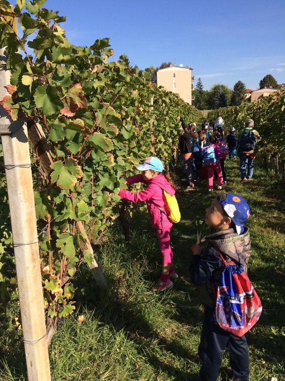 Mercoledì 3 ottobre, noi bambini delle classi seconde della Scuola Rodari siamo andati a vendemmiare alla Scuola Enologica di Alba. Una volta arrivati lì, ci ha accolti il professor Binello, che ci ha accompagnati nelle vigne e ci ha insegnato a raccogliere l’uva, dopo averci spiegato come è fatta la vite. Abbiamo raccolto l'uva Pinot nero e l'abbiamo messa in alcune ceste. Ci siamo divertiti a vendemmiare con le nostre forbicine!