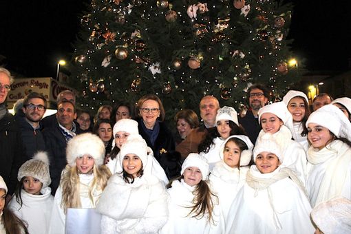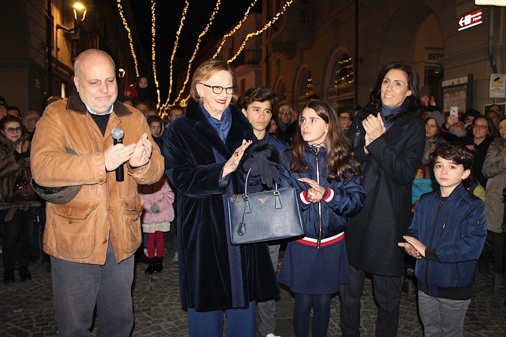 Ad accenderlo è stata la signora Maria Franca Fissolo Ferrero, alla cerimonia insieme alla nuora Luisa Strumia e ai nipotini Michael, Marie Eder e John. E proprio i tre piccoli hanno slacciato il fiocco dorato sulla targa che ricorda il dono dell’albero a cura della famiglia.