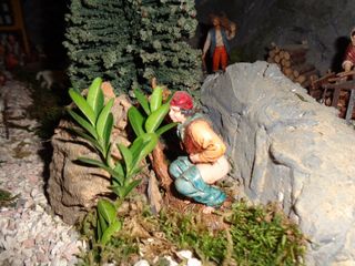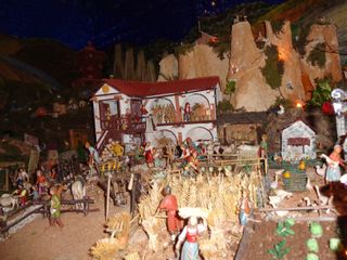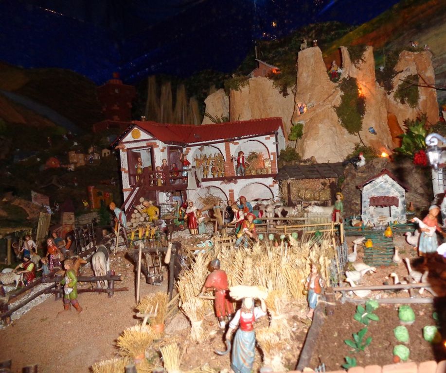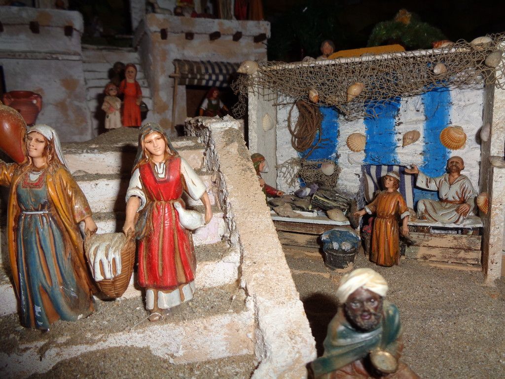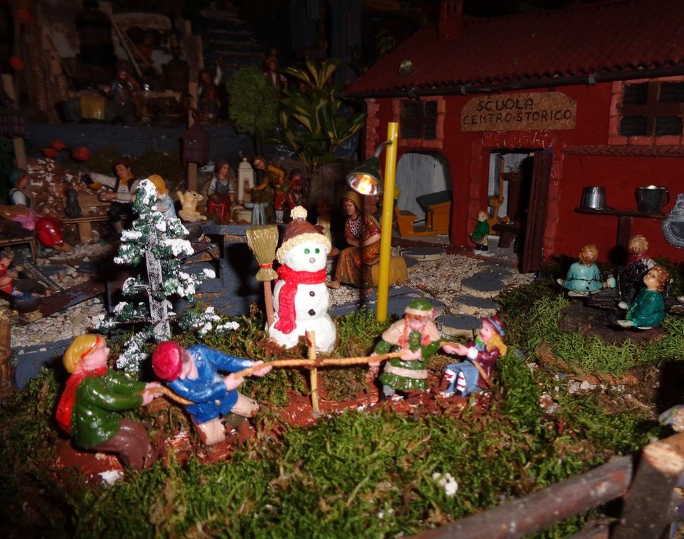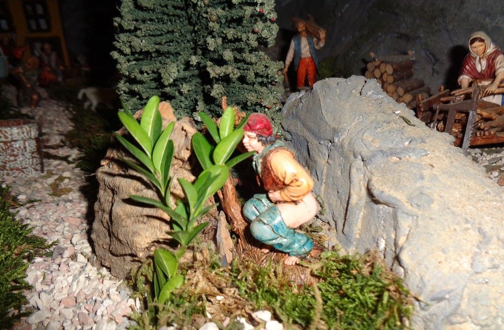 Paese che vai… in Catalogna oltre a Gesù, Giuseppe, Maria il bue e l’asinello non sarebbe Natale se tra i pastori non fosse posta quella figurina con i pantaloni calati e intenta ai suoi bisogni fisiologici. Ma il caganer non è l’unica attrazione di questa maestosa opera. Pesci rossi che guizzano vivi nel laghetto all’ombra del pescatore, i rumori della natura e del lavoro quotidiano, in mezzo ad una pletora di ricordi di famiglia che hanno trovato spazio nell’allestimento: “Eravamo camperisti ed abbiamo trasferito nel presepe, arricchendolo ogni volta, elementi nuovi che richiamano a tradizioni o culture dei paesi che abbiamo visitato. Penso, ad esempio, alle conchiglie raccolte sulle spiagge della Bretagna e della Normandia che ora arredano una delle botteghe, oppure al personaggio che porta l’Emmental, donato a mia moglie dagli espositori svizzeri in occasione di Cheese”.