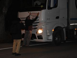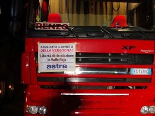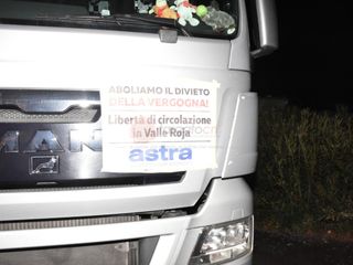 I tir percorreranno due volte il tragitto dalla frazione Trucco di Ventimiglia sino al confine italiano di Fanghetto, rallentando il traffico. Ogni mezzo pesante ha incollato un cartello: “Aboliamo il divieto della vergogna! Libertà di circolazione in Valle Roya”.