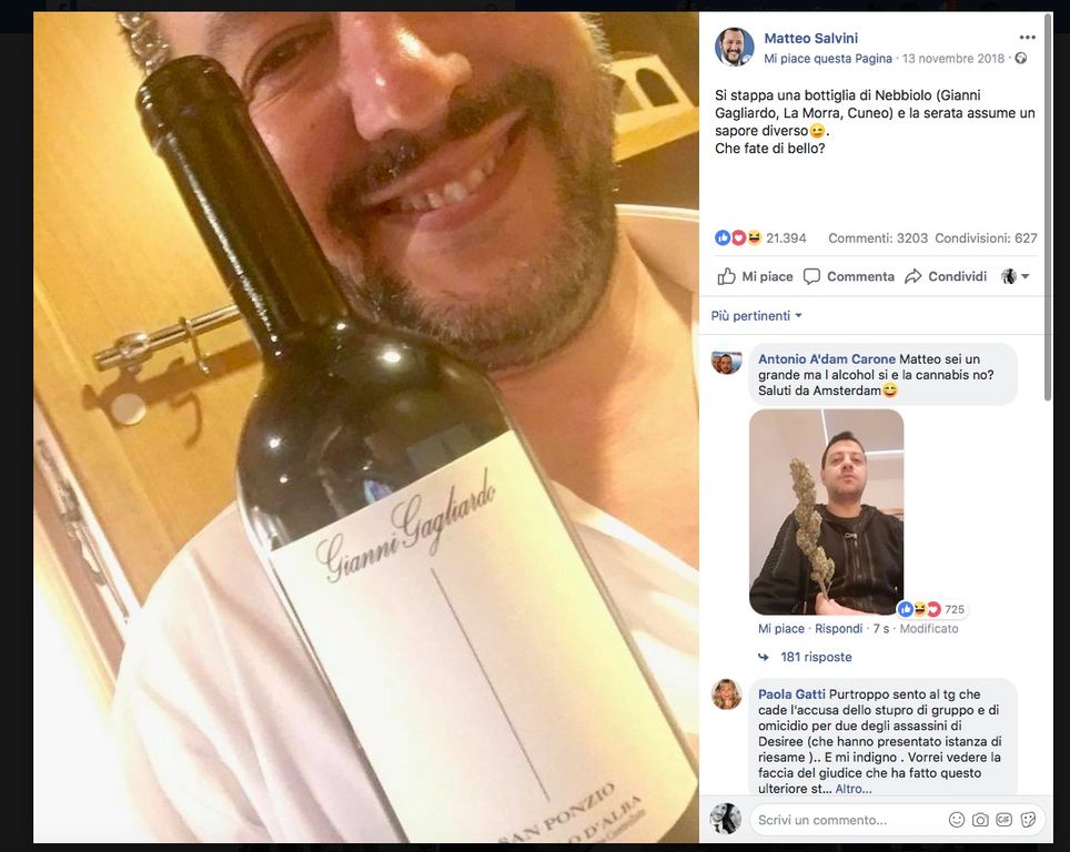 Lo scorso 13 novembre a potersi fregiare dei peraltro frequenti riferimenti culinari e gastronomici del rifondatore della Lega in salsa sovranista era stato infatti un noto barolista, chiamato in causa con tanto di etichetta a favore di camera ma anche di riferimenti geografici e vinicoli: "Si stappa una bottiglia di Nebbiolo (Gianni Gagliardo, La Morra, Cuneo) e la serata assume un sapore diverso. Che fate di bello?", con tanto di emoticon ammiccante a comprovare la bontà del prodotto, in un post che ha incassato 21mila "mi piace", 3200 commenti e 600 condivisioni (per la Nutella erano, rispettivamente, 54mila, 11mila e 2.800).