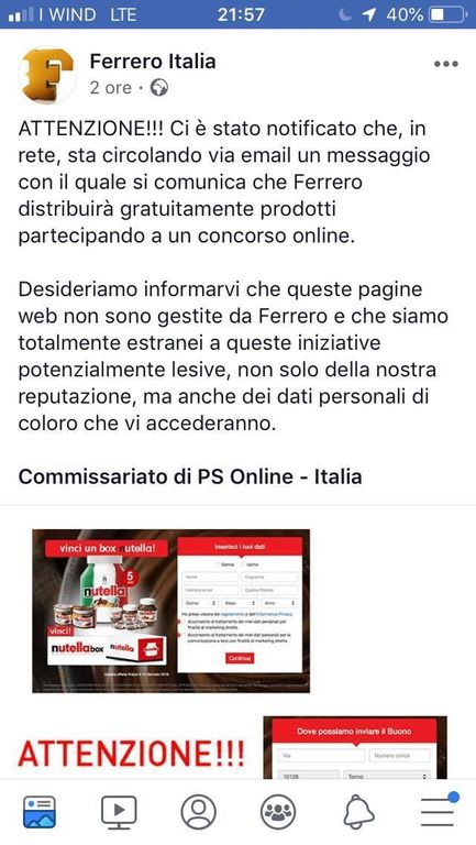 In questa direzione l’avviso pubblicato nelle scorse ore dal profilo Facebook ufficiale di Ferrero Italia, che dà conto di come in questi giorni starebbe circolando via email un messaggio con il quale "si comunica che Ferrero distribuirà gratuitamente prodotti partecipando a un concorso online". "Desideriamo informarvi – mette in guardia l'azienda – che queste pagine web non sono gestite da Ferrero e che siamo totalmente estranei a queste iniziative potenzialmente lesive, non solo della nostra reputazione, ma anche dei dati personali di coloro che vi accederanno". Come dire, navigatore avvisato… .