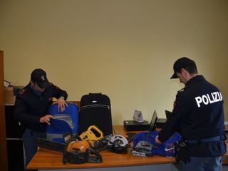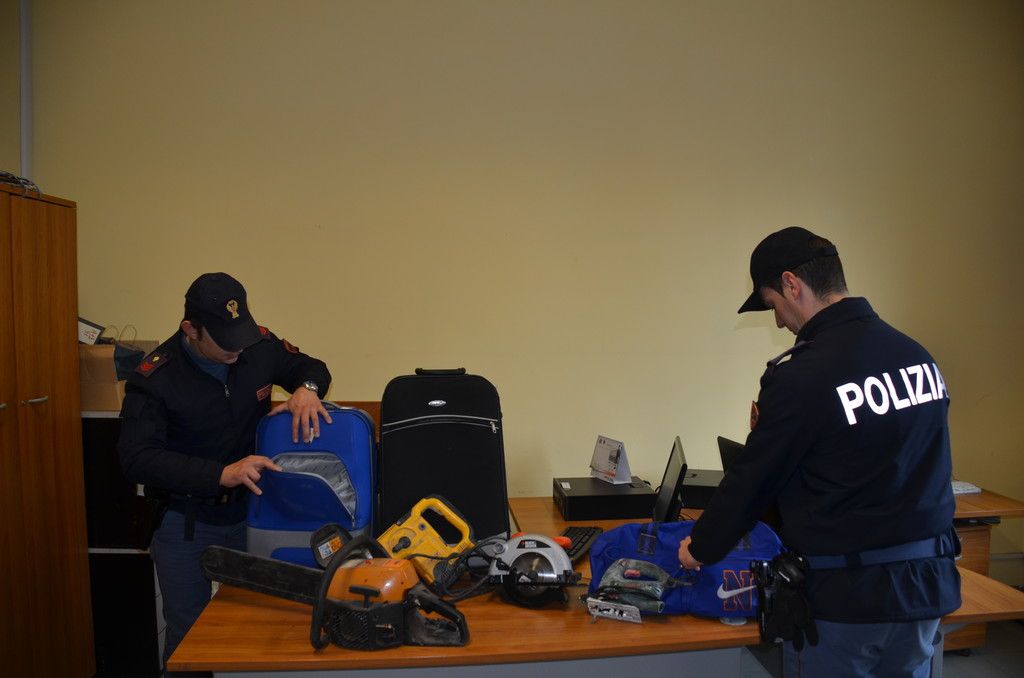 Nell'ufficio Volanti della Questura sono visionabili gli oggetti provento di furto: due trolley e un borsone, una motosega, un trapano a percussione, una sega circolare e un seghetto