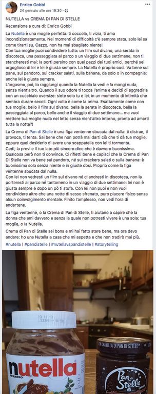 "La Nutella è una moglie perfetta: ti coccola, ti vizia, ti ama incondizionatamente. Nei momenti di difficoltà c'è sempre stata, solo lei sa come tirarti su. Non ha mai sbagliato niente!" attacca Gobbi nel posto, per poi spiegare, diverse righe dopo, che la Crema di Pan di Stelle è invece "una figa ventenne sbucata dal nulla: ti distrae, ti provoca, ti tenta. Sai bene che non potrà mai darti ciò che ti dà tua moglie, eppure quel desiderio di avere una scappatella con lei ti tormenta".