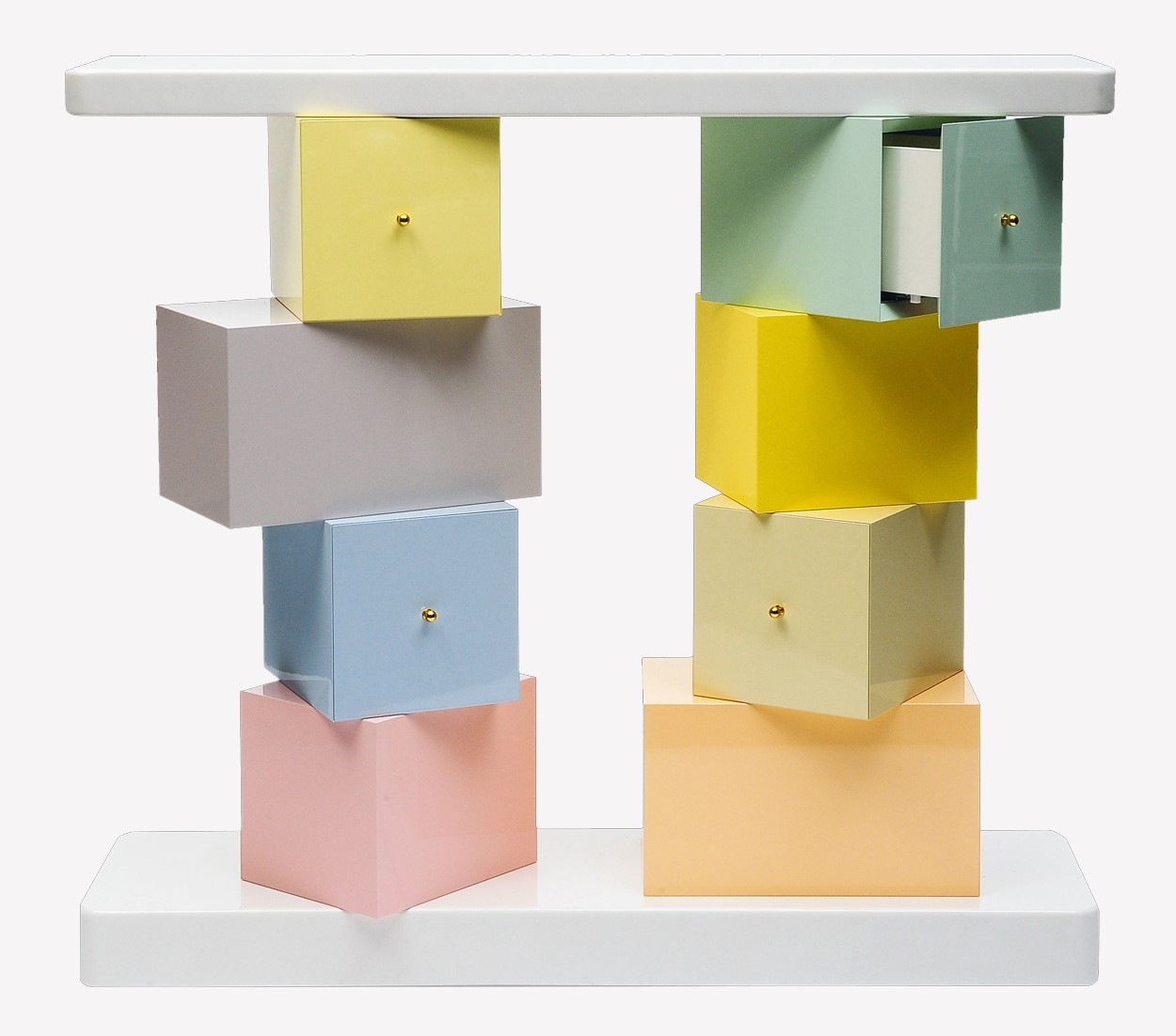61.705 Cubica - Console composta da mattoncini cubici in legno dai delicati colori pastello. Base e piano di appoggio in marmo di Lasa. Prototipo prova d'artista Edizione di 9 esemplari - Dim. 130X45x120 - Produzione Cleto Munari 2002