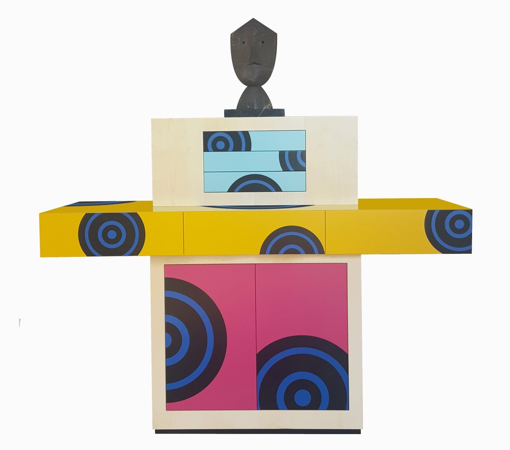 61.706 Mobilino - Mobile in acero naturale con elemento centrale, ante e cassetti laccati. Maschera in marmo “Caravaggio”. Prototipo - Dim. 192x60x202 (altezza massima) - Produzione Cleto Munari 2019