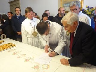 La festa è proseguita nel salone confraternale per il brindisi e la firma del verbale da parte dei nuovi membri, vestiti con i paludamenti ufficiali, segno esteriore del particolare impegno di fede e di amore verso la Chiesa e verso il prossimo.