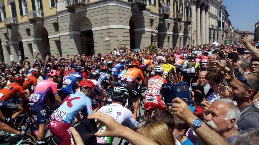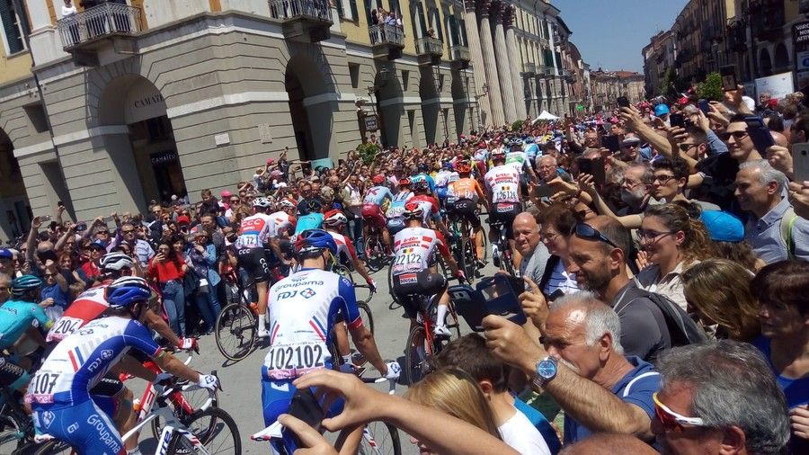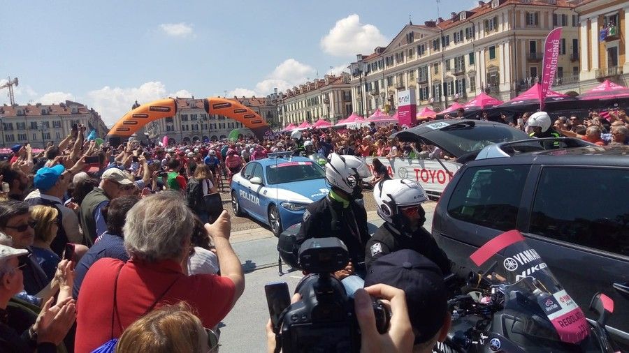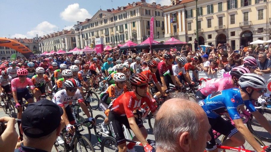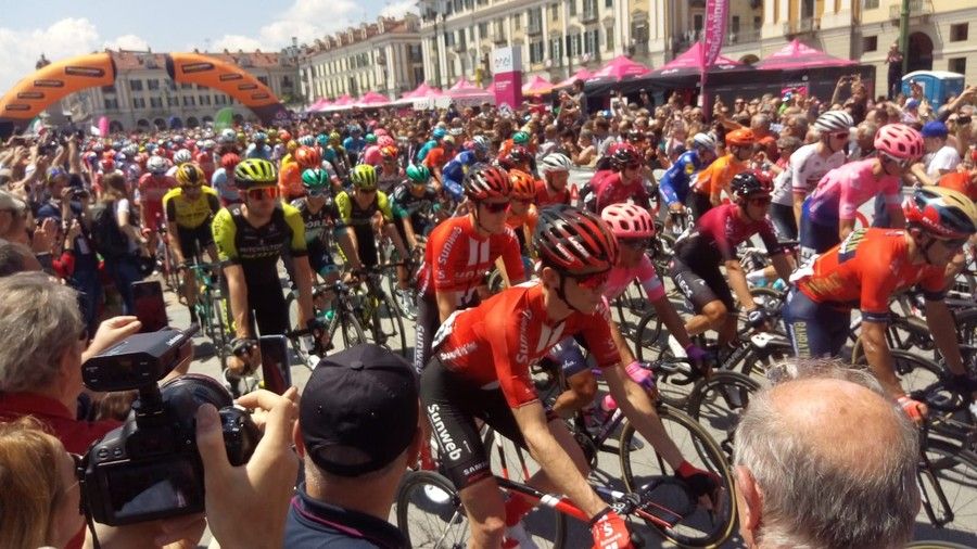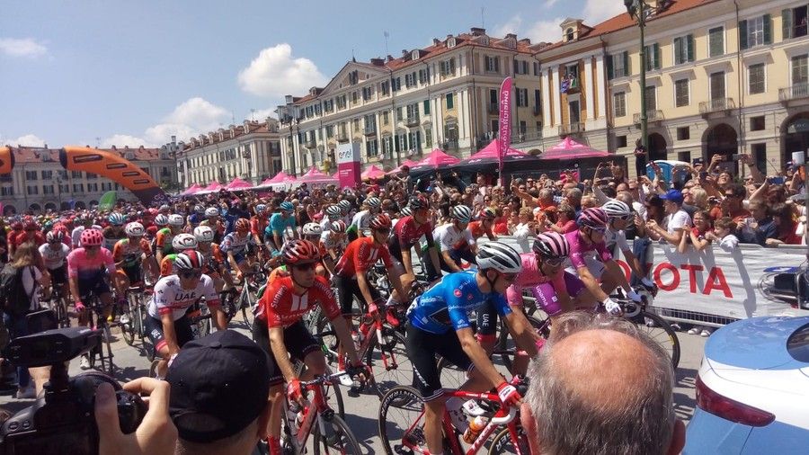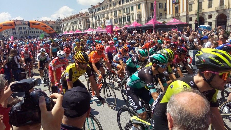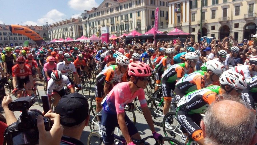 E' partita alle 13.17 da piazza Galimberti la tappa 12 del Giro d'Italia: la mitica Cuneo-Pinerolo, dedicata alla leggenda di Fausto Coppi. Tappa che riporta alla mente l’impresa del Campionissimo al Giro d’Italia 1949 quando, da solo in fuga, inflisse oltre 11 minuti a Gino Bartali.