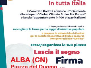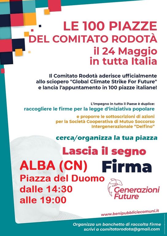 Nell’ambito della campagna 100 PIAZZE, promossa dal Comitato Rodotà in tutta Italia, aderendo allo sciopero mondiale per l’emergenza climatica, ad Alba in piazza Garibaldi il 24 maggio dalle ore 14:30 alle 19:00, grazie all'impegno del coordinamento regionale Piemonte, con la presenza di Giampaolo Cavallaro, si raccoglieranno le firme per la legge di iniziativa popolare sui beni comuni e si potrà conoscere tutto sulla società cooperativa di mutuo soccorso.
