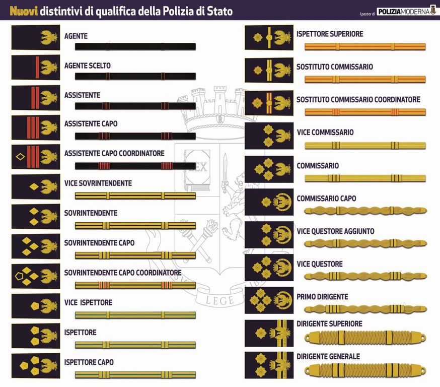 Per realizzare i nuovi gradi è stato interpellato l’esperto di araldica Michele D’Andrea, che ha ricostruito la simbologia e gli emblemi cardine della polizia di stato come l’aquila, riproposta e stilizzata con l’aggiunta di altri particolari elementi specifici per ogni tipo di mansione dell’agente.