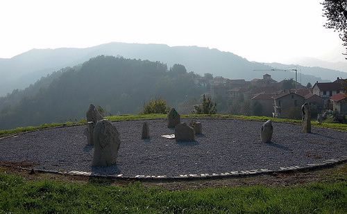 Nell’installazione che Beppe Schiavetta realizzò sulla "collina del vento", tra la chiesetta romanica di San Sebastiano e il piccolo cimitero del paese, nove blocchi di pietra dipinti con tecnica astratta campeggiano su un cerchio di ghiaia. Ai loro piedi due scritte in metallo col verso "Quello che veramente ami rimane, il resto è scorie" e il saluto poundiano "Pax tibi, pax mundi". All'ingresso del memoriale anche un cartello riportante tre Cantos (LXXXI, XXXVIII, XLV) del poeta americano che visse buona parte della propria esistenza in Italia e nella ligure Rapallo in particolare, prima di spegnersi a Venezia nel 1972. E quaderni, destinati a raccogliere le impressioni dei visitatori, sui quali negli anni sono comparse frasi vergate in lingue da tutta Europa.