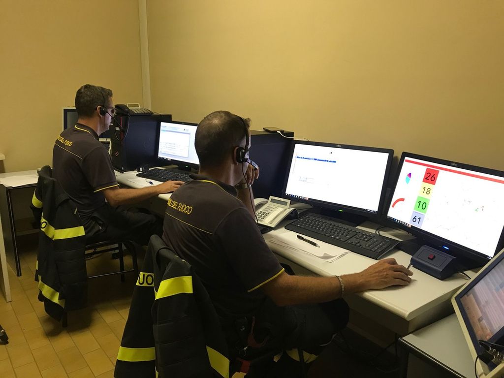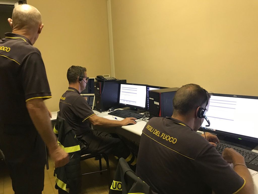 Nella sala operativa dei vigili del fuoco, ieri sera 5 settembre, dalle 21.30 alle 22.30 circa, in piena emergenza maltempo.