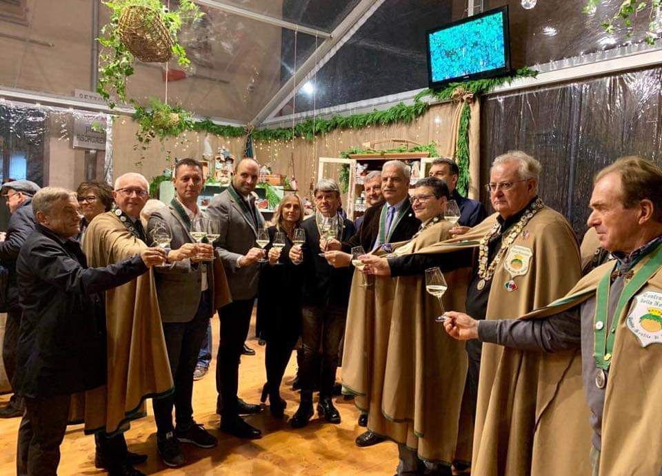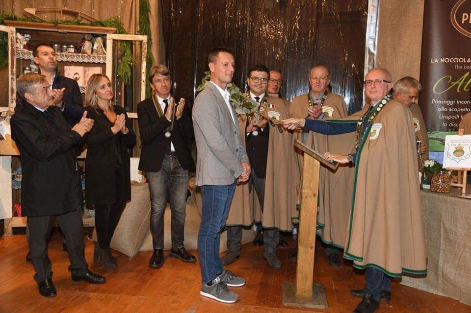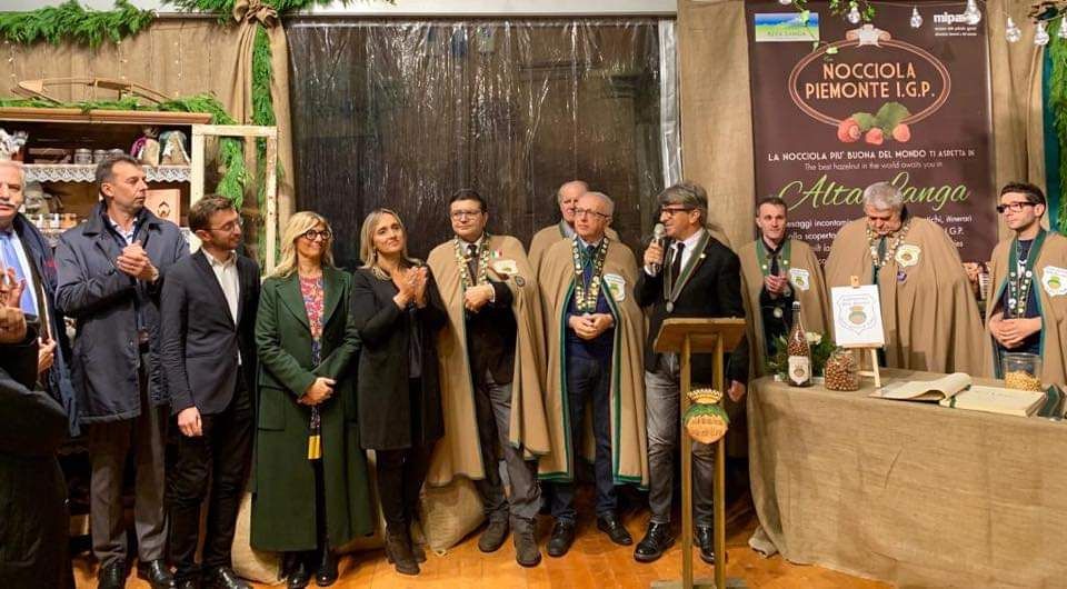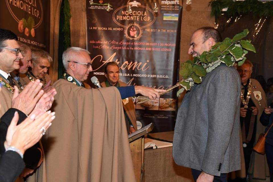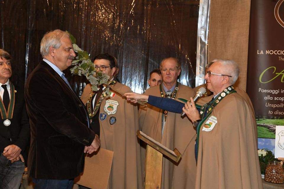 Il ramo di nocciolo del gran maestro Ginetto Pellerino è così sceso sulla spalla di Mauro Carbone, direttore dell'Ente Turismo Langhe Monferrato Roero, di Giandomenico Genta, presidente della Fondazione Cassa di Risparmio di Cuneo, e Sergio Lasagna, presidente del Consorzio per la valorizzazione e la tutela della Nocciola Piemonte Igp.
