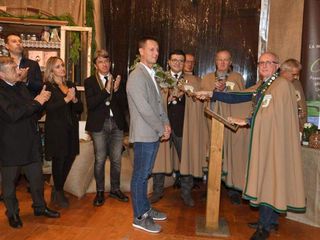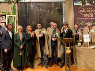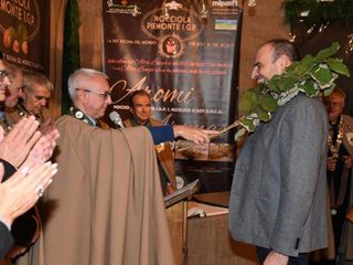 Il ramo di nocciolo del gran maestro Ginetto Pellerino è così sceso sulla spalla di Mauro Carbone, direttore dell'Ente Turismo Langhe Monferrato Roero, di Giandomenico Genta, presidente della Fondazione Cassa di Risparmio di Cuneo, e Sergio Lasagna, presidente del Consorzio per la valorizzazione e la tutela della Nocciola Piemonte Igp.