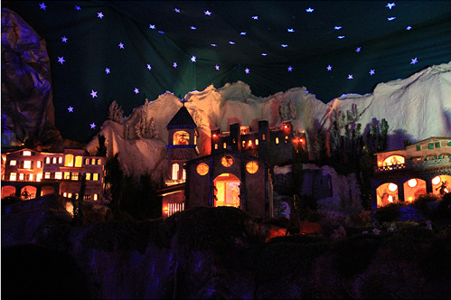 Da osservare i numerosi giochi d’acqua e le luci che si alternano in alba-giorno-tramonto-notte, con la comparsa della luna piena e della stella cometa. Inoltre sono molto curati i particolari all’interno delle case e nell’insieme del presepio e gli oltre 80 movimenti meccanici.