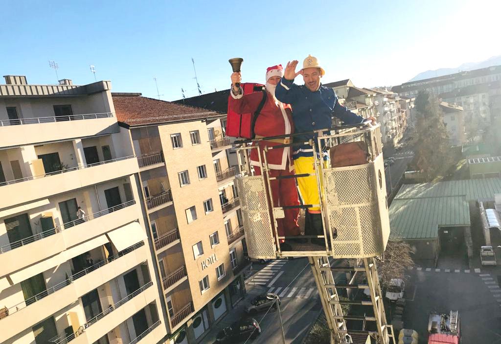 Una consegna di doni davvero speciale, che per la gioia dei più piccoli ha visto Babbo Natale arrivare nientedimeno che a bordo di una vertiginosa autoscala, affiancato dalla mascotte degli amati pompieri.
