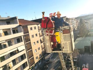 Una consegna di doni davvero speciale, che per la gioia dei più piccoli ha visto Babbo Natale arrivare nientedimeno che a bordo di una vertiginosa autoscala, affiancato dalla mascotte degli amati pompieri.