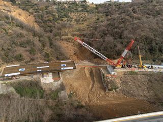 L'operazione, che ha richiesto l’impiego di due gru di dimensioni ragguardevoli, ha consentito a tempo di record (poco più di due mesi) di posare il ponte in acciaio-calcestruzzo lungo 58 metri, dopo che la settimana scorsa erano state completate le spalle del nuovo viadotto, con le attività che si erano concentrate anche nell’assemblaggio delle travi in acciaio corten.