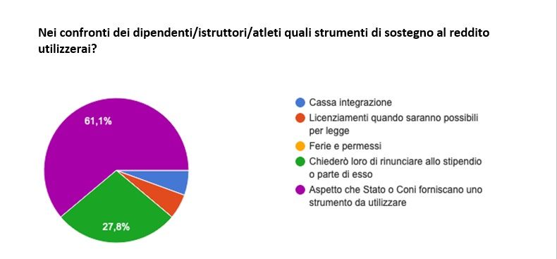 Il 78,9% dichiara che non potrà pagare stipendi / compensi ai propri dipendenti, istruttori, atleti e collaboratori. Per interpretare questo dato occorre calarsi nella realtà del mondo sportivo e sapere cosa sono i 'contrattini' cosa accade nelle ore extra, far finta di non vedere rende tutti deboli oggi. Il dato è da brividi.