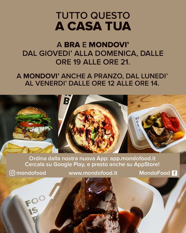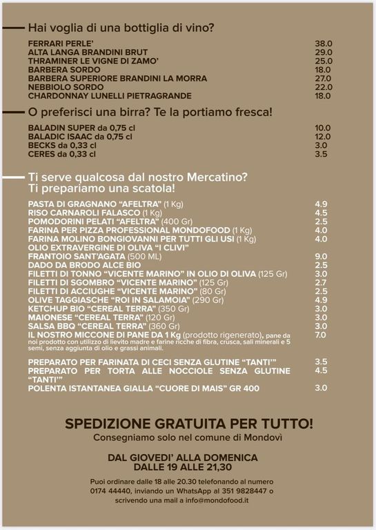 Puoi ordinare dalle 18 alle 20.30 telefonando al numero 0174-44.440 o inviando un WhatsApp al 351-9828447 o scrivendo una e-mail a info@mondofood.it