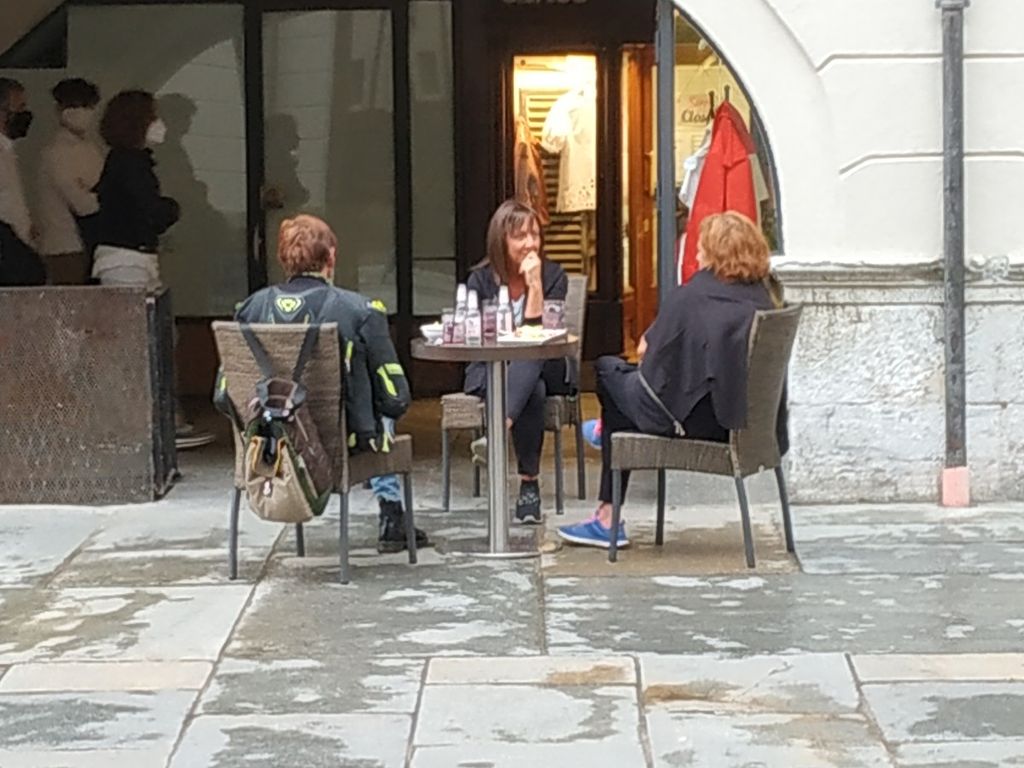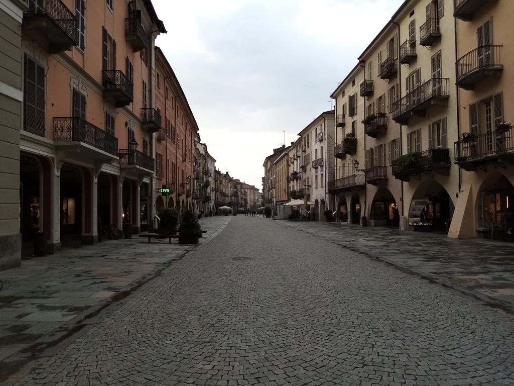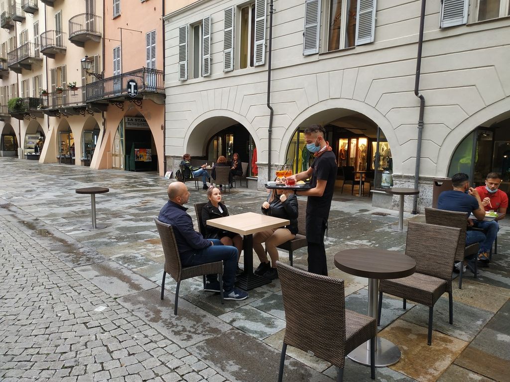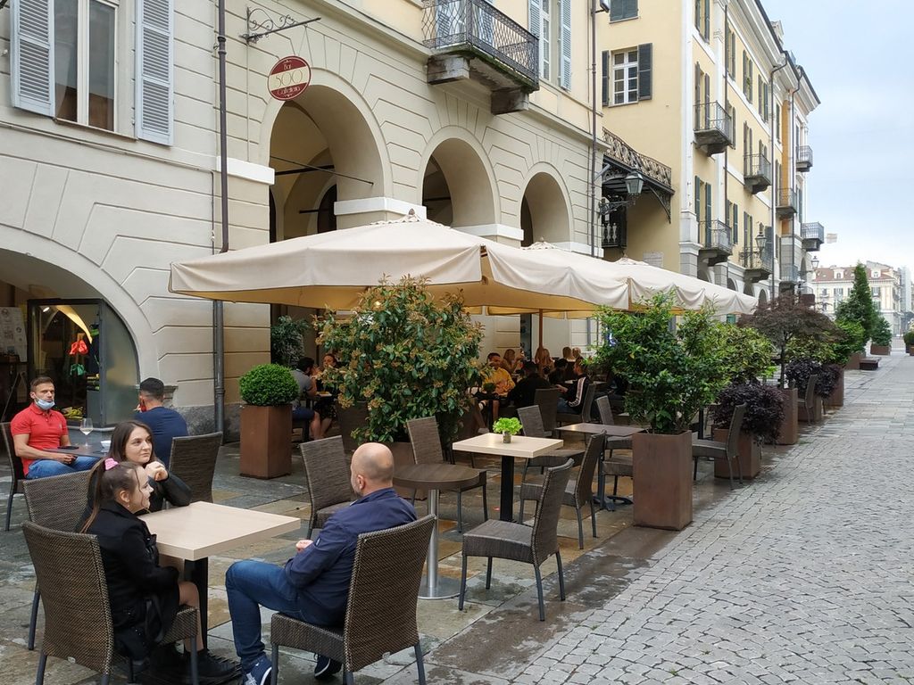 Cuneo riapre: i portici e la zona pedonale di via Roma tornano a popolarsi di passanti impegnati negli acquisti, o nel primo, vero aperitivo con amici e conoscenti ai tavoli dei bar.