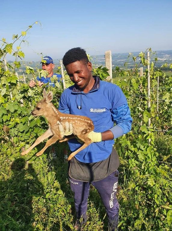 Mentre il verificarsi di incontri certamente meno piacevoli (leggi qui) riportano d’attualità la problematica della fauna selvatica che prolifera nelle campagne dell’Albese, è un’immagine che non può che intenerire quella scattata ieri nelle campagne di frazione Santa Rosalia, dove un piccolo di capriolo si è fatto avvicinare da alcuni dipendenti di una cooperativa agricola, impegnati nei periodici lavori di cura dei vigneti.