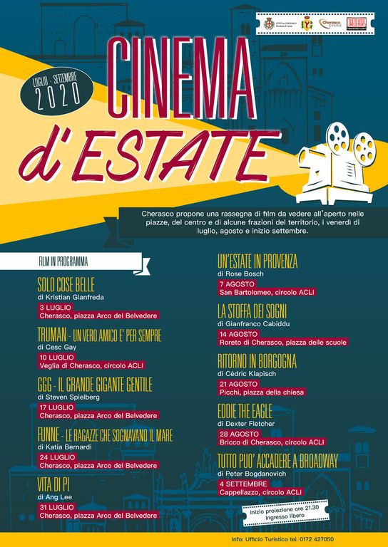 Il mese successivo il cinema è itinerante in alcune frazioni cheraschesi: “Un'estate in Provenza” di Rose Bosch sarà il 7 agosto a San Bartolomeo; “La stoffa dei sogni” di Gianfranco Cabiddu il 14 agosto a Roreto; “Ritorno in Borgogna” di Cédric Klapisch il 21 agosto ai Picchi; “Eddie the eagle” di Dexter Fletcher il 28 agosto a Bricco. L’ultimo appuntamento sarà il 4 settembre a Cappellazzo con il film “Tutto può accadere a Broadway” di Peter Bogdanovich.