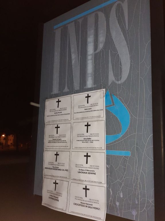 Centinaia di manifesti funebri sono stati affissi dai militanti di CasaPound Italia davanti alle sedi INPS in decine di città italiane, tra cui Cuneo, Saluzzo, Bra, Alba e Mondovì. L'intento è denunciare la morte dell’economia italiana e di migliaia di piccoli e piccolissimi imprenditori, messi in ginocchio dalle politiche governative e “giustiziati” dai disservizi, dai ritardi e dall’incapacità di gestire i pochi aiuti statali da parte dell’Istituto Nazionale di Previdenza Sociale.