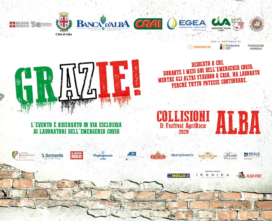 “Abbiamo potuto realizzare questo sogno grazie ai numerosi partner che hanno condiviso con noi un’idea semplice: la convinzione che a tutte queste persone in qualche modo la comunità dovesse dire un Grazie - commenta il direttore artistico di Collisioni, Filippo Taricco. - Questo grande progetto rappresenta una sfida importante per la nostra città” commentano il sindaco di Alba Carlo Bo e l’Assessore al turismo Emanuele Bolla “Siamo orgogliosi di aver lavorato a questo progetto che rappresenta un momento di restituzione a chi ha dato tanto al paese, e al contempo un’occasione di promozione territoriale”. Banca d’Alba è stato un attore principale dell’iniziativa, ed ha contribuito fin dall’inizio alla sua ideazione. “Sono stati mesi molto difficili, in cui Banca d’Alba ha intensificato il proprio impegno economico e sociale a sostegno della comunità” commenta il Presidente di Banca d’Alba Tino Cornaglia “Con la ripartenza ci è parso opportuno ringraziare chi ha garantito i servizi primari con il proprio lavoro e per farlo abbiamo ragionato insieme a Collisioni, al Comune e ad altri attori del territorio per trovare un segnale, un gesto di attenzione verso i veri protagonisti. Siamo felici che questo si sia tramutato in un festival che, in assoluta sicurezza, animerà l’estate albese”.