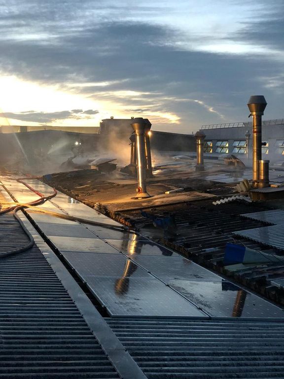 Tetto a fuoco della ditta Balocco di Fossano. Le fiamme hanno compromesso anche dei pannelli fotovoltaici sulla copertura dello stabilimento.