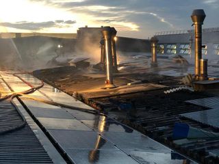 Tetto a fuoco della ditta Balocco di Fossano. Le fiamme hanno compromesso anche dei pannelli fotovoltaici sulla copertura dello stabilimento.