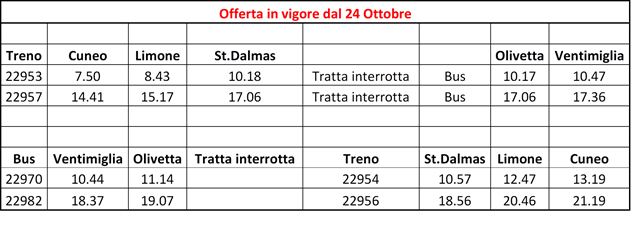 È arrivata in tarda mattinata la comunicazione di RFI che da domani, sabato 24 ottobre, sarà nuovamente percorribile un tratto della linea ferroviaria Cuneo-Limone Piemonte fino a Saint-Dalmas interrotta dall’alluvione del 2 e 3 ottobre scorso.