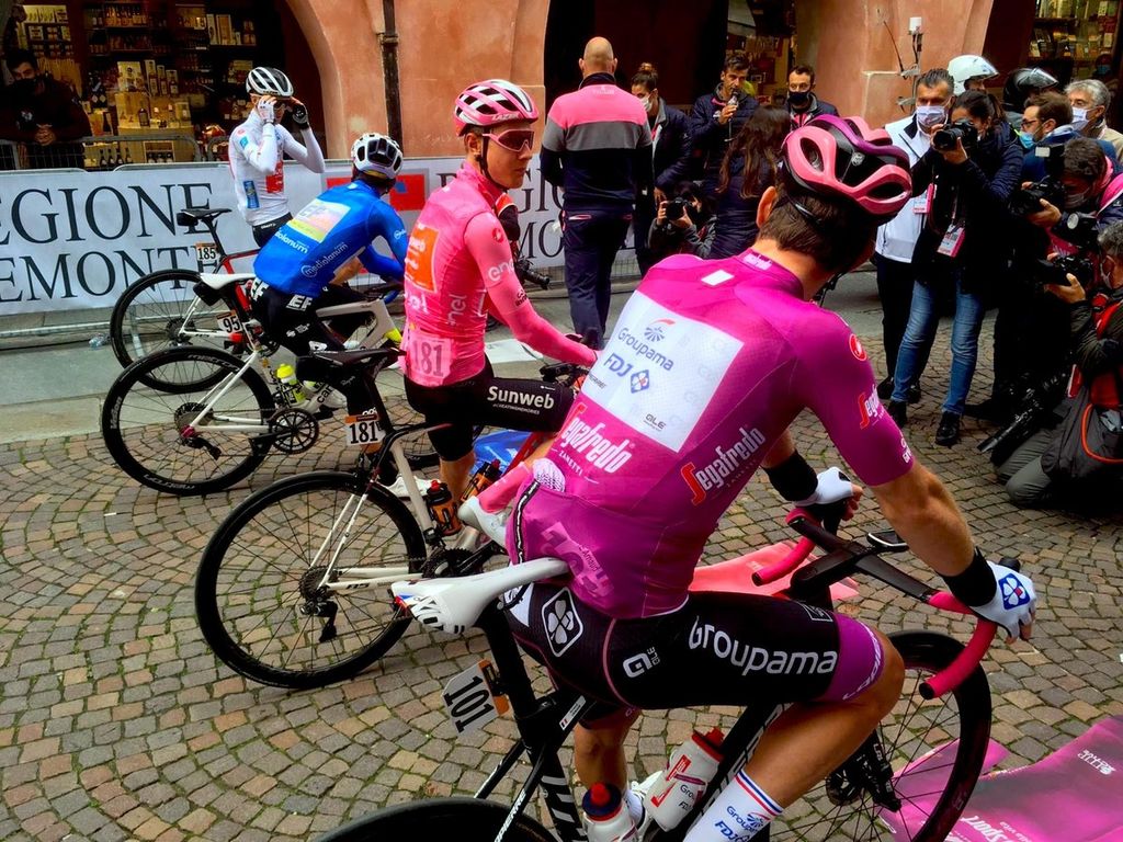 E' stato il sindaco di Alba, Carlo Bo, bandierina rosa in mano, a dare lo "start" alla 20esima e penultima tappa del Giro d'Italia, la "Alba-Sestriere".
