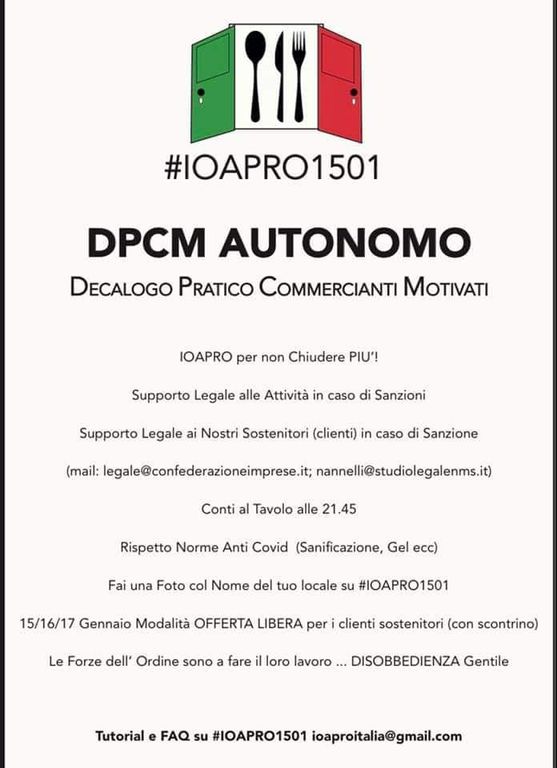 La protesta dovrebbe partire dalla serata di questo venerdì, 15 gennaio. A indicarne le modalità un’anonima locandina dove sotto al titolo "Dpcm Autonomo" (ma l’acronimo ormai ben noto a tutti viene declinato negli improbabili definizione di "Decalogo Pratico Commercianti Motivati") si fa riferimento a un’apertura – nelle intenzioni destinata a proseguire nelle giornate e serate di sabato 16 e domenica 17 – decisa "per non chiudere più". Dopodiché si promette supporto legale alle attività e ai sostenitori in caso di sanzioni, probabili visto quanto previsto nei vari Dpcm (quelli di Conte, per capirsi), nell’attesa che quello in arrivo nelle prossime ore definisca il nuovo panorama della stretta dovuta al rimontare del Covid.