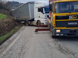 Nell’intento di evitare un altro mezzo proveniente in senso contrario, il 50enne polacco alla guida del pesante autoarticolato si è spostato troppo a ridosso della banchina, andando a finire con le ruote posteriori nel fossato che in quel tratto di strada affianca la carreggiata.