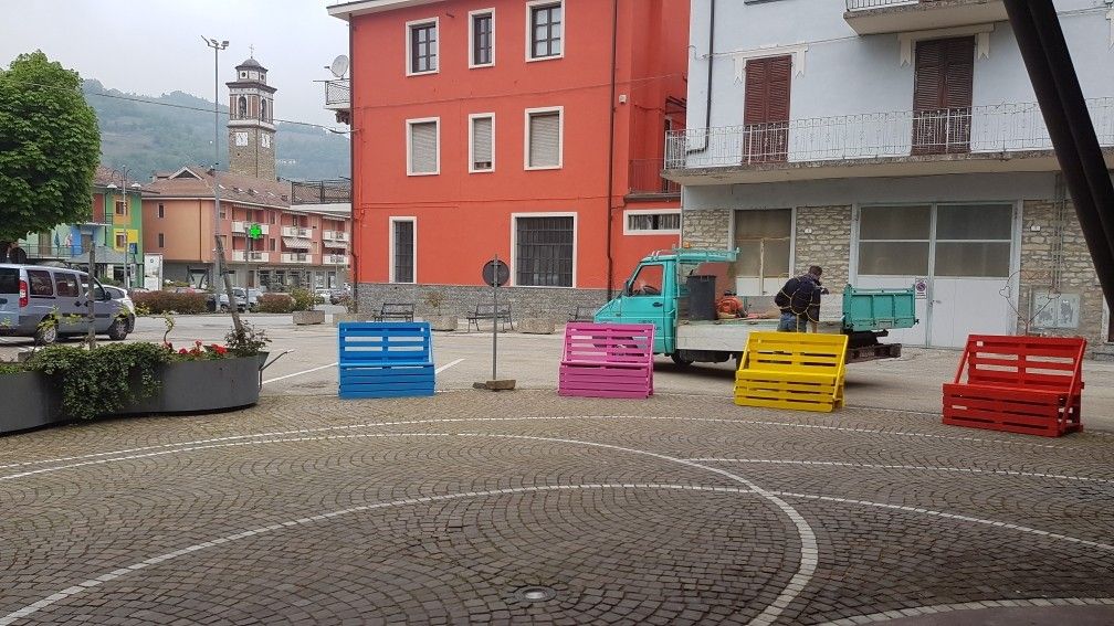 La centrale piazza del paese langarolo si è abbellita con sei panchine colorate costruite tutte con materiale legnoso di riciclo. Le nuove installazioni sono sovrastate ognuna da curiosi animaletti e fiori disegnati dalla piccola Martina e realizzate dal Sindaco utilizzando bacchette di ferro opportunatamente piegate e colorate.