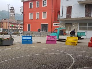 La centrale piazza del paese langarolo si è abbellita con sei panchine colorate costruite tutte con materiale legnoso di riciclo. Le nuove installazioni sono sovrastate ognuna da curiosi animaletti e fiori disegnati dalla piccola Martina e realizzate dal Sindaco utilizzando bacchette di ferro opportunatamente piegate e colorate.