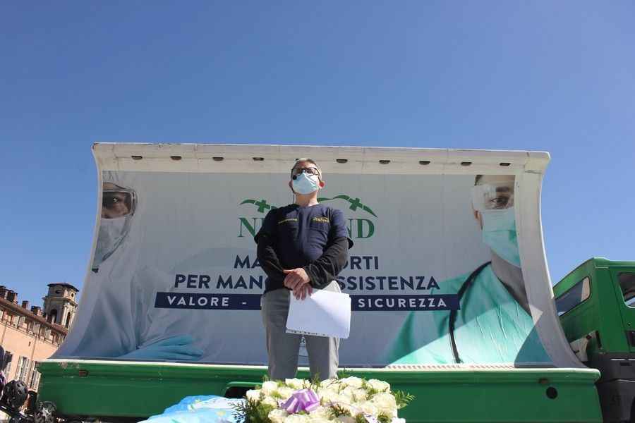 Gli infermieri hanno posato un cuscinetto di fiori per non dimenticare le 11.549 vittime del virus in Piemonte. “Abbiamo imparato una lezione ma non è stata utile. Noi ne usciamo stanchi, ci vogliono risorse” è il messaggio lanciato dai lavoratori degli ospedali. "Il post pandemia sarà uno tsunami" è il monito lanciato dagli infermieri.