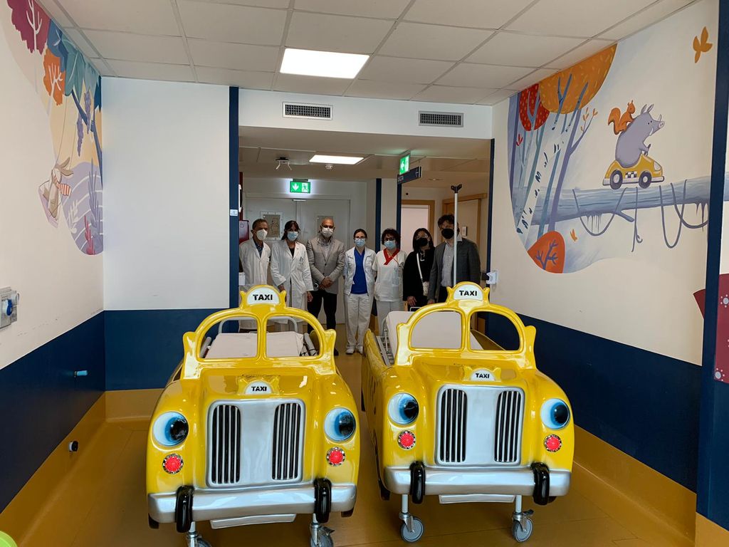 Per questo sono stati donati due taxi ludobarelle che serviranno per un trasporto alternativo e divertente per i pazienti più piccoli, per integrare il progetto di allestimento e umanizzazione del reparto.