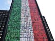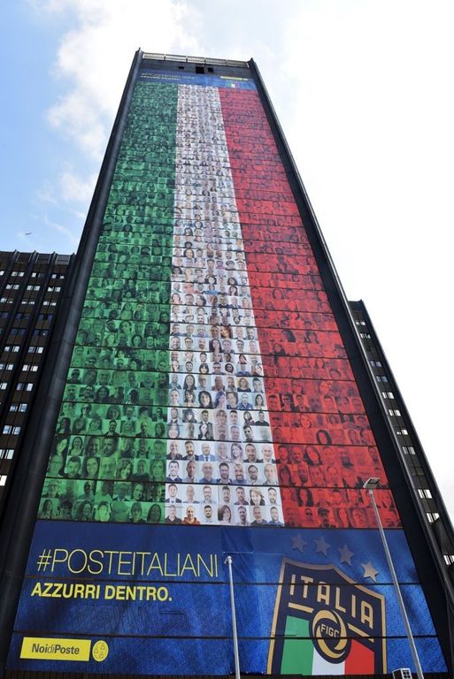 La maxi-bandiera ricopre interamente la facciata dell’edifico che ospita la sede centrale di Poste Italiane a Roma e riporta il volto di migliaia di dipendenti dell’azienda che hanno partecipato all’iniziativa #Posteitaliani, inviando la propria foto e ‘mettendoci la faccia’ per incoraggiare i ragazzi di Mister Roberto Mancini in vista dei quarti di finale contro il Belgio che si giocheranno venerdì 2 luglio a Monaco di Baviera.