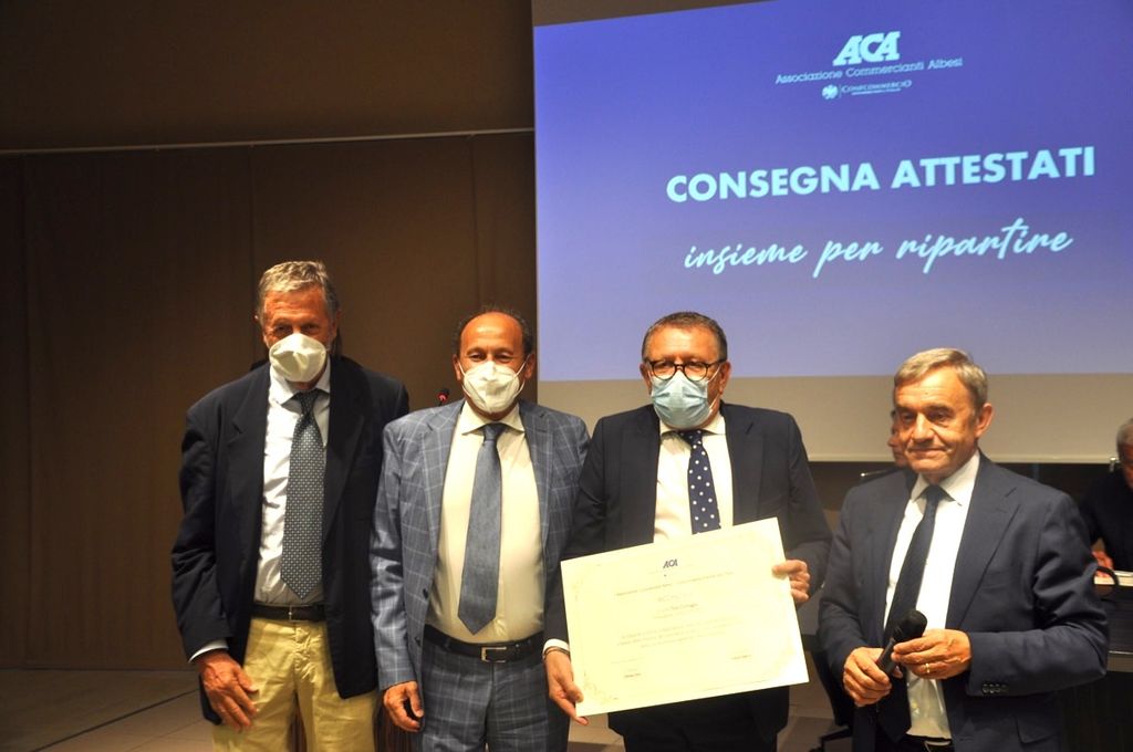 Di fronte alla platea dei commercianti albesi e alle tante autorità (a partire dal presidente regionale Alberto Cirio e dall’assessore piemontese alla Sanità Luigi Icardi, passando per gli onorevoli Paganelli e Zanoletti, i numerosi sindaci e amministratori, i presidenti di tutte le Ascom della provincia e quelli delle associazioni dell’industria e dell’artigianato) erano intanto sfilati i destinatari dei riconoscimenti che l’Aca ha voluto assegnare in segno di gratitudine per la collaborazione avuta in questo particolare momento di difficoltà della categoria. Targhe andate al sindaco di Alba Carlo Bo, al presidente di Banca d’Alba Tino Cornaglia, presente insieme al direttore generale dell'istituto Riccardo Corino, al direttore generale dell’Asl Cn2 Massimo Veglio, al responsabile medico dell’hub vaccinale Aca dottor Massimo Foglia, alle stesse imprenditrici di Limone Piemonte e Garessio che nell’ottobre scorso furono destinatarie di un aiuto da parte dell’associazione e dell’Enoteca Regionale di Grinzane (presente col presidente Roberto Bodrito), a loro volta portatrici di un bene augurante saluto nel segno della ripartenza.