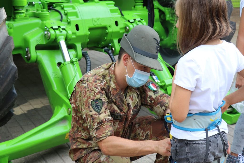Immancabile l’installazione di una palestra di arrampicata artificiale, dove, supportati da due istruttori militari di alpinismo del Doi (come storicamente viene chiamato il Reggimento) i cittadini hanno potuto cimentarsi con corde, rinvii ed appigli provando per poche ore la quotidianità addestrativa degli oltre 11.000 alpini.