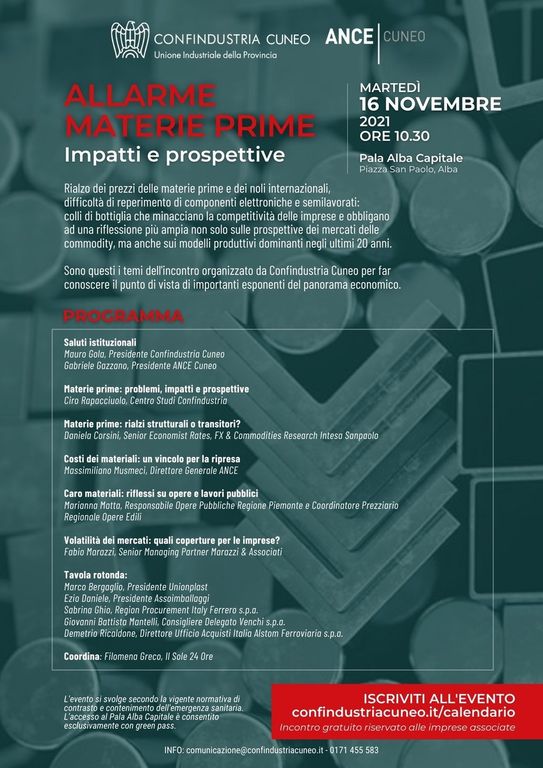 Sulla questione materie prime, Confindustria Cuneo ha voluto accendere i riflettori, sollevando il problema dopo aver raccolto le preoccupazioni delle imprese e proponendo anche, attraverso il CSI (Centro Servizi peer l’Industria), il “Monitor materie prime”, un nuovo servizio per i suoi associati che offre consulenze personalizzate sui prezzi delle principali commodity per una gestione efficace degli approvvigionamenti e del magazzino. In quest’ottica si inserisce l’incontro dal titolo “Allarme materie prime – Impatti e prospettive”, in programma martedì 16 novembre al Pala Alba Capitale, con inizio alle 10,30 (accrediti dalle 10): un momento di approfondimento per analizzare questi temi ed individuare strumenti e strategie di supporto della competitività delle imprese sui mercati, attraverso il punto di vista di importanti esponenti del panorama economico nazionale. Organizzato da Confindustria Cuneo insieme ad ANCE Cuneo, il convegno sarà moderato dalla giornalista de “Il Sole 24 Ore” Filomena Greco. Dopo gli interventi introduttivi del presidente di Confindustria Cuneo Mauro Gola e del presidente di ANCE Cuneo Gabriele Gazzano, i Centri Studi di Confindustria e di Intesa San Paolo, rappresentati rispettivamente da Ciro Rapacciuolo e Daniela Corsini, forniranno un quadro della situazione attuale e le proiezioni al 2022 per quanto riguarda il mercato delle materie prime. Seguirà l’intervento, in videocollegamento, del direttore generale ANCE Massimiliano Musmeci, che approfondirà la situazione del comparto edile la cui ripresa è minacciata dal caro materiali. Tra i relatori anche Marianna Matta, responsabile opere pubbliche della Regione Piemonte e coordinatore del prezzario regionale delle opere edili, il cui intervento verterà sui riflessi di rincari e difficoltà di approvvigionamento sulle opere pubbliche, e Fabio Marazzi, Senior Managing Partner Marazzi&Associati, che si concentrerà sulla volatilità dei prezzi e sulle coperture per le imprese. Il convegno si concluderà con una tavola rotonda a cui parteciperanno il presidente di Unionplast Marco Bergaglio, il presidente di Assoimballaggi Ezio Daniele, il Region Procurement Italy del gruppo Ferrero Sabrina Ghio, il consigliere delegato di Venchi Giovanni Battista Mantelli e il direttore Ufficio Acquisti Italia di Alstom Ferroviaria Demetrio Ricaldone.