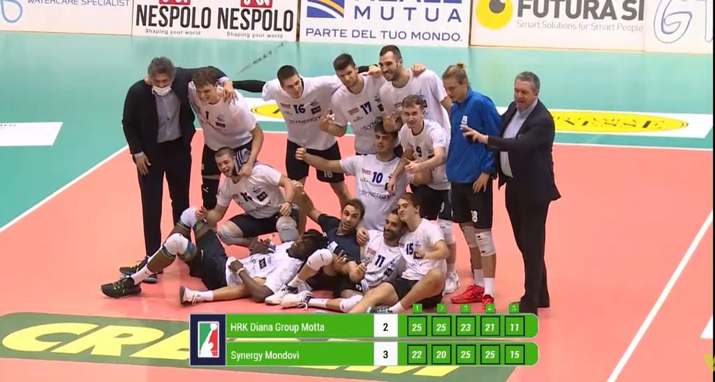 Impresa del Vbc Synergy Mondovì, che in casa della terza forza del campionato, l’HRK Diana Group Motta di Livenza vince al tie-break. Un risultato reso ancora più prezioso dal fatto che la squadra trevigiana, terza in classifica, in questa stagione non aveva mai perso in casa.