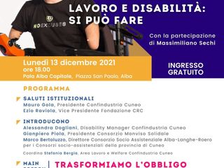L’appuntamento del Pala Alba Capitale, dal titolo “#NOEXCUSES – Lavoro e disabilità: si può fare”, introdotto dai saluti istituzionali del presidente di Confindustria Cuneo Mauro Gola e del vice presidente della Fondazione Crc Ezio Raviola, proseguirà con gli interventi di Alessandra Dogliani, disability manager di Confindustria Cuneo, Giampiero Piola, presidente del Consorzio Monviso Solidale, in rappresentanza dei Consorzi Socio Assistenziali della provincia di Cuneo, e Marco Bertoluzzo, direttore del Consorzio socio assistenziale Alba-Langhe-Roero.