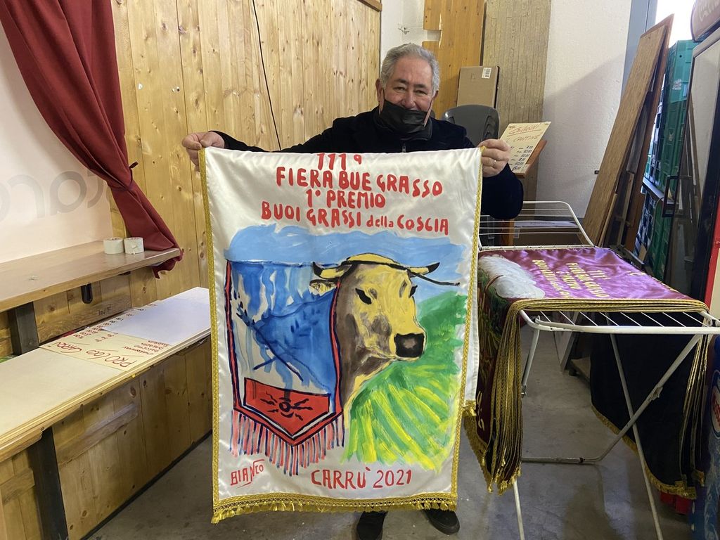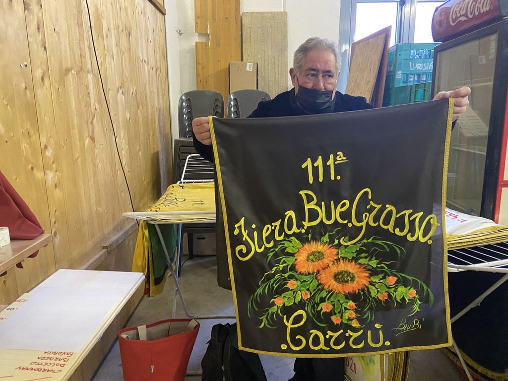 “Sono un pittore e l’arte è la mia passione – ci ha raccontato Bruno -. Sono 25 anni che dipingo con l’acrilico le gualdrappe per la ‘Fiera del Bue Grasso’ e ne realizzo circa 120 l’anno. Per questa edizione della rassegna, che è la 111ª, ne ho realizzate una settantina. Sulla gualdrappa dei primi tre posti viene inserito l’anno, il premio, la categoria dell’animale e l’edizione della fiera. Vi si riporta anche la data, in modo tale che non siano ripetibili, e alla fine vengono autenticate col nome della macelleria cui il bue è destinato. Le fantasie variano a ogni edizione. Le gualdrappe generiche, invece, quelle che vengono consegnate ai vincitori a partire dal quarto e fino al nono posto, le realizza mia moglie. In giro per l’Italia ci sono circa 3mila mie gualdrappe. Sono contento!”.