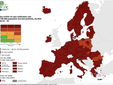 Così come è nella colorazione che indica il livello più alto dell'incidenza del contagio sulla popolazione quasi tutta l'Europa salvo alcune aree di Polonia, Ungheria e Romania (in arancione).