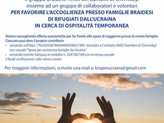 Il gruppo braidese "Amici dei bambini di Chernobyl" insieme a un gruppo di collaboratori e volontari per favorire l'accoglienza sul territorio dei rifugiati ucraini in cerca di ospitalità temporanea sta raccogliendo offerte per far fronte alle spese di soggiorno presso le famiglie ospitanti.