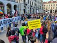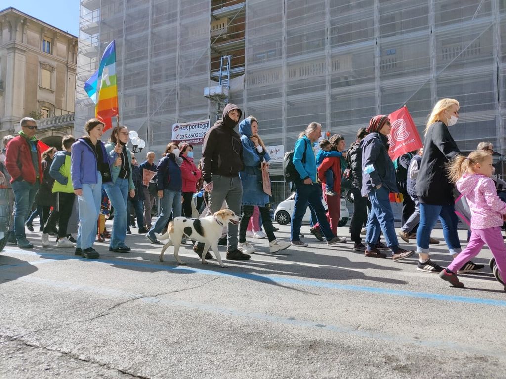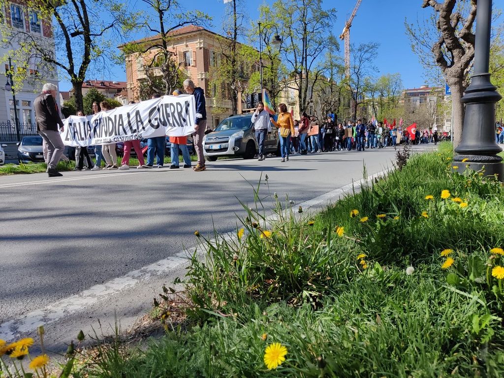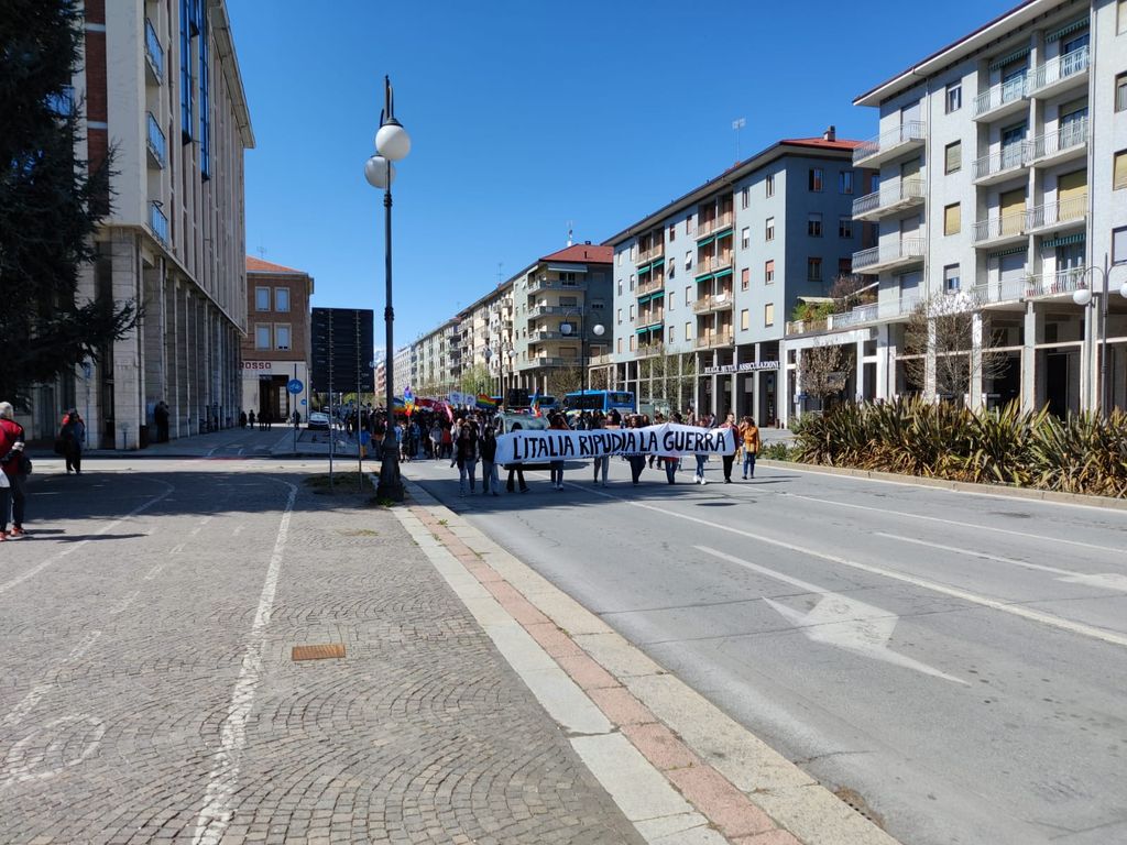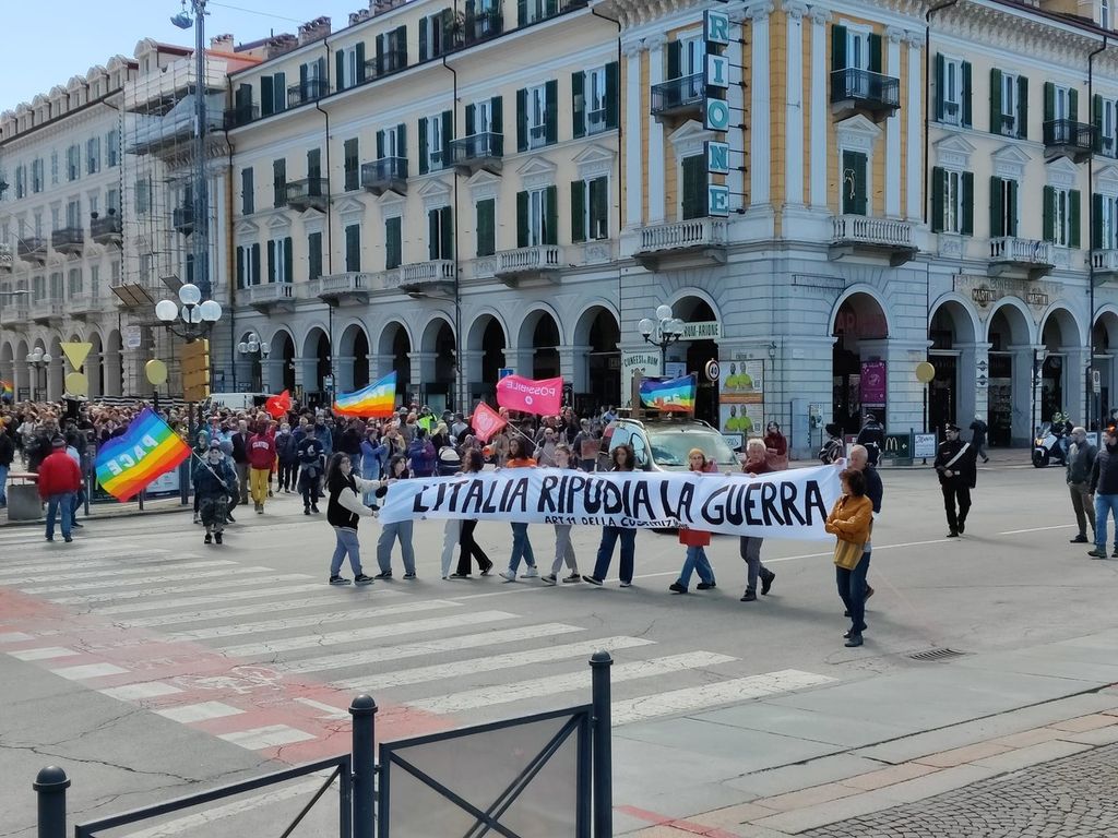 Partenza e qualche tappa per ricordare i numeri delle vittime delle ultime 30 guerre nel mondo, in piazza Europa e poi in corso Dante. Uno stop anche in piazza Galimberti, dove c'è stato un minuto di silenzio e dove gli scout hanno distribuito dei foglietti con le parole da cancellare e non usare più. Parole di violenza e morte.